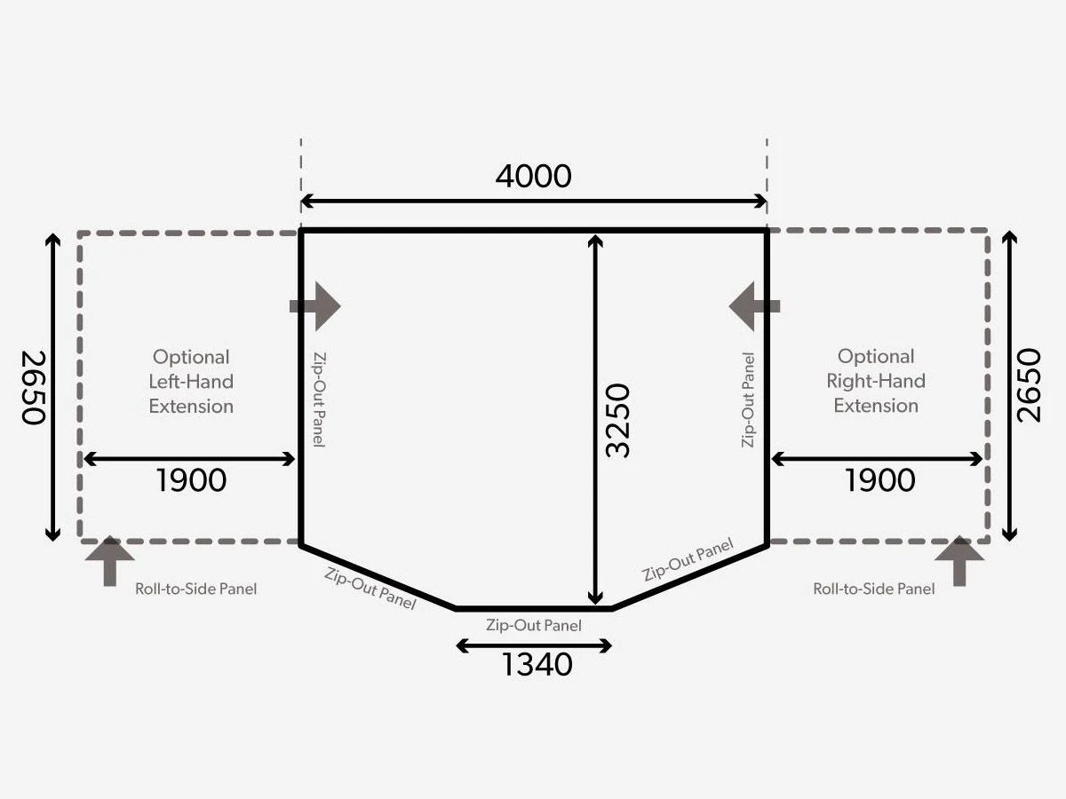De voortent is 400 cm breed. Dit betekent dat je bij een caravan een rechte rail van minstens 400 cm nodig hebt om de voortent op te kunnen zetten. Wil je de voortent in de rail van je luifel schuiven? Dan moet de luifel minstens 400 cm lang zijn.