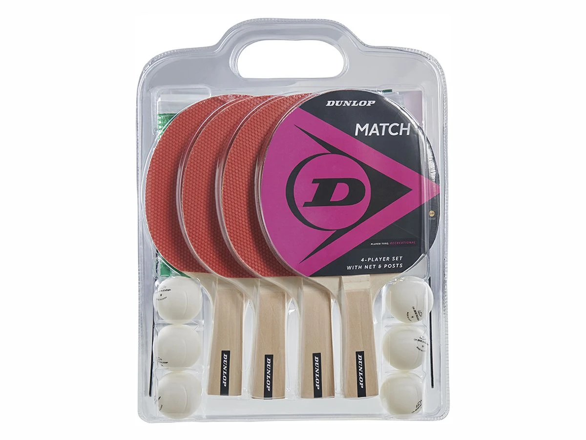 Deze Dunlop tafeltennisset bestaat uit vier batjes, een net met staanders en zes tafeltennisballetjes.