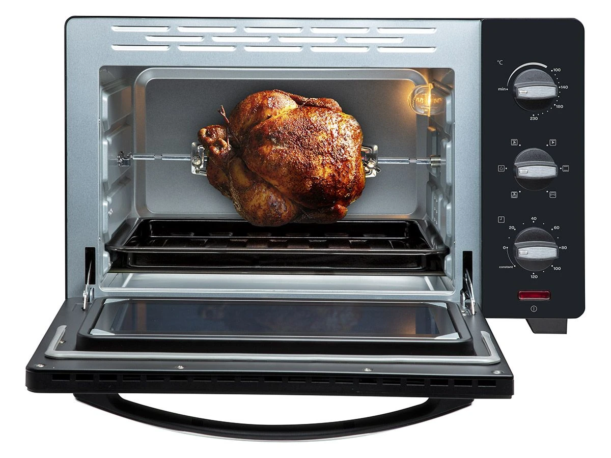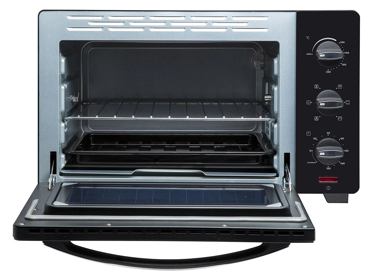 De oven heeft een inhoud van 30 liter, heeft een regelbare temperatuur tot 230°C en is voorzien van een timer die in kunt instellen tot 120 minuten. Door de non-sticklaag aan de binnenzijde, is de oven makkelijk schoon te maken. De oven wordt geleverd met een bakplaat, ovenrooster en een kruimelplaat.