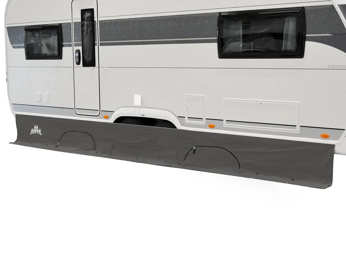 De tochtstrook is passend voor alle gangbare merken caravans en is 600 centimeter lang, heb je nu niet deze lengte? Dan kun je het overtollige gedeelte omslaan. Dit kan tot een lengte van 400 centimeter, dat is de maat van het uiteinde van de twee grote opbergvakken.