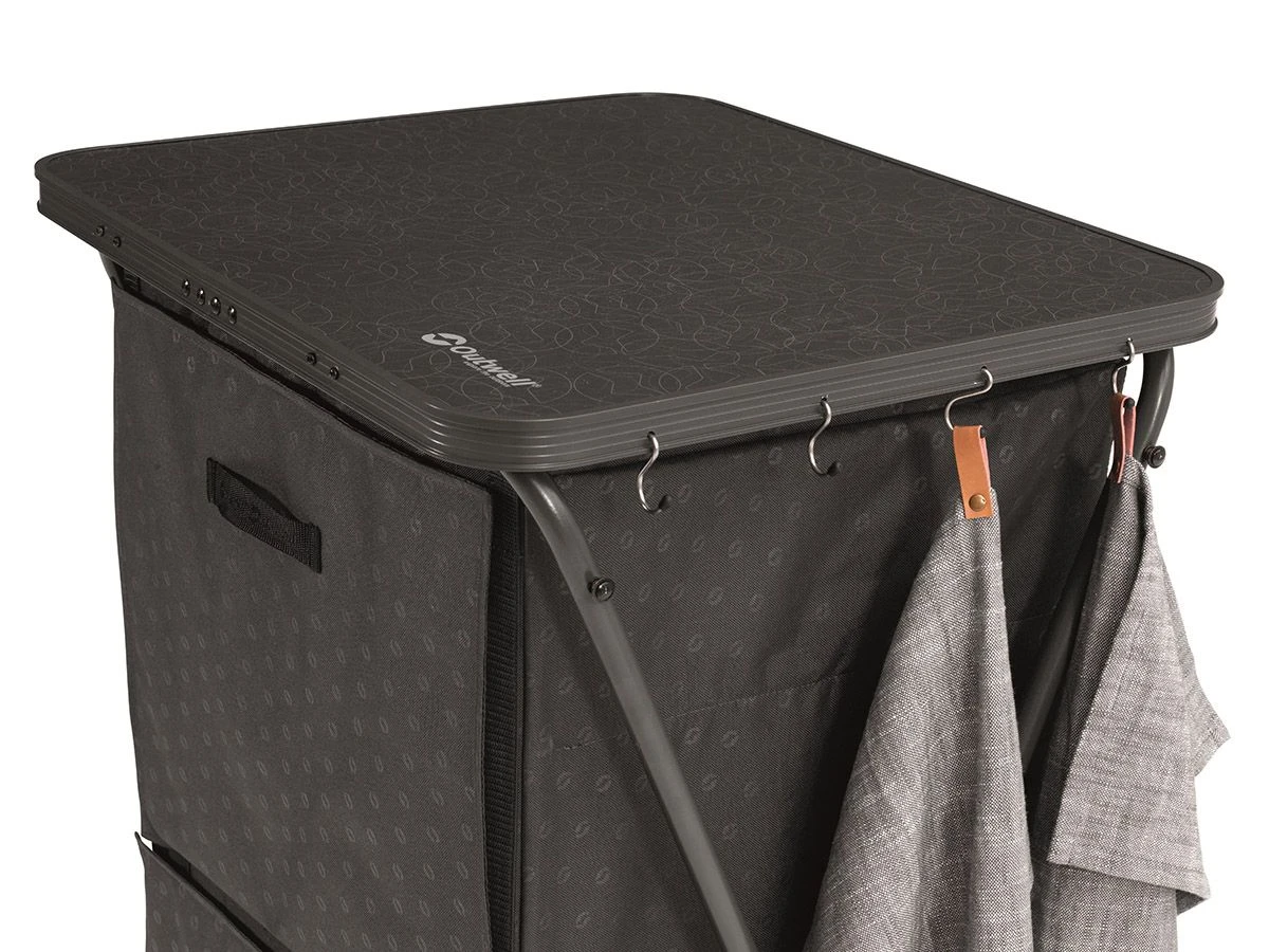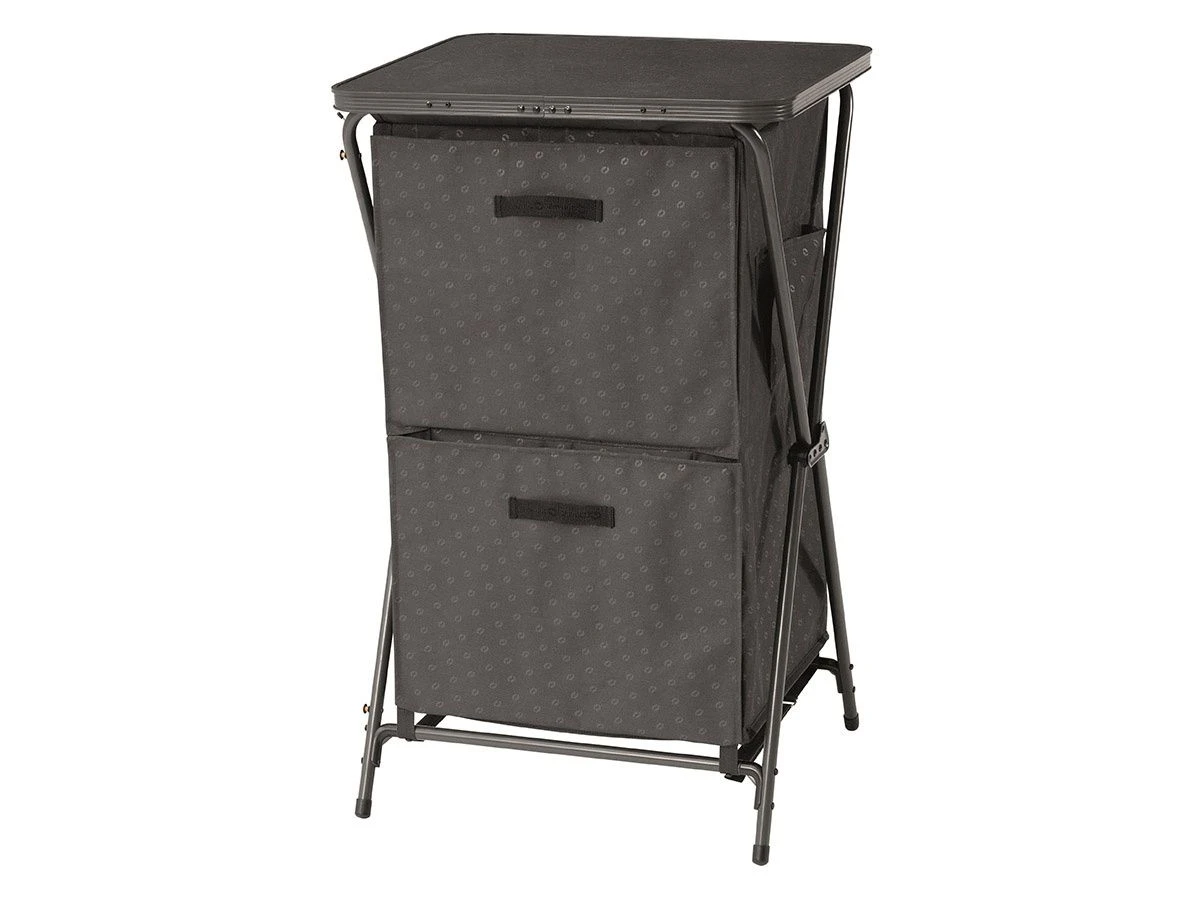 Deze campingkast is binnen enkele seconden in en uit te klappen en er is geen montage nodig. Het inklapbare frame is gemaakt van aluminium met daaroverheen een polyester bekleding. Het blad is gemaakt van laminaat en is niet weerbestendig, laat de kast dus niet tijdens een regenbui buiten staan. De kast wordt geleverd inclusief een handige draagtas voor het makkelijk opbergen en vervoeren van de kast.