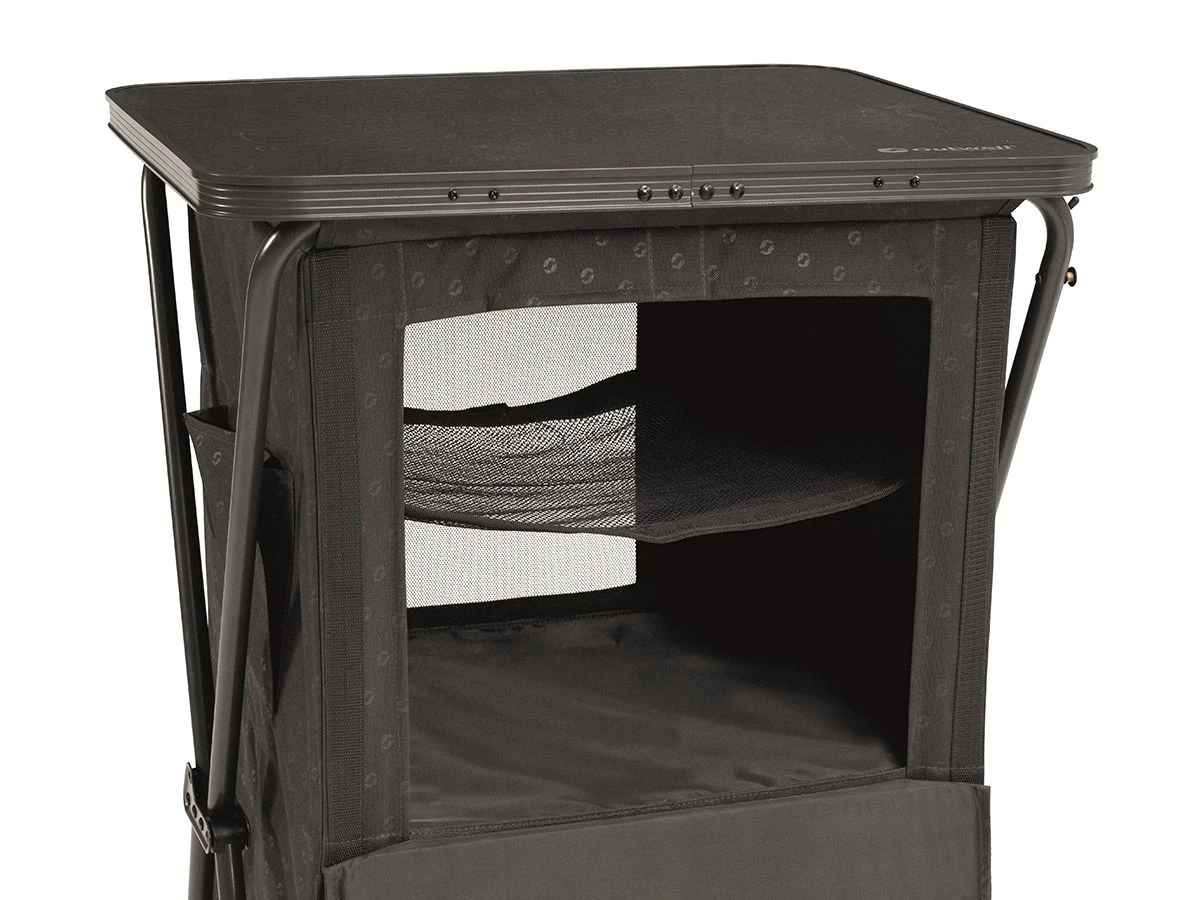 De Domingo campingkast heeft twee grote massieve planken (draagvermogen per plank tot 10 kg) en een gaasplank bovenin (draagvermogen tot 5 kg). Aan de zijkant van de kast bevindt zich een klein opbergvakje voor bijvoorbeeld je zonnebrandcrème die je elk uur even wilt gebruiken. Aan de achterkant zit een deel mesh gaas voor een goede ventilatie en luchtcirculatie. Verder zitten er aan de zijkant een aantal haakjes waar je bijvoorbeeld je hand- en theedoek aan kunt ophangen.